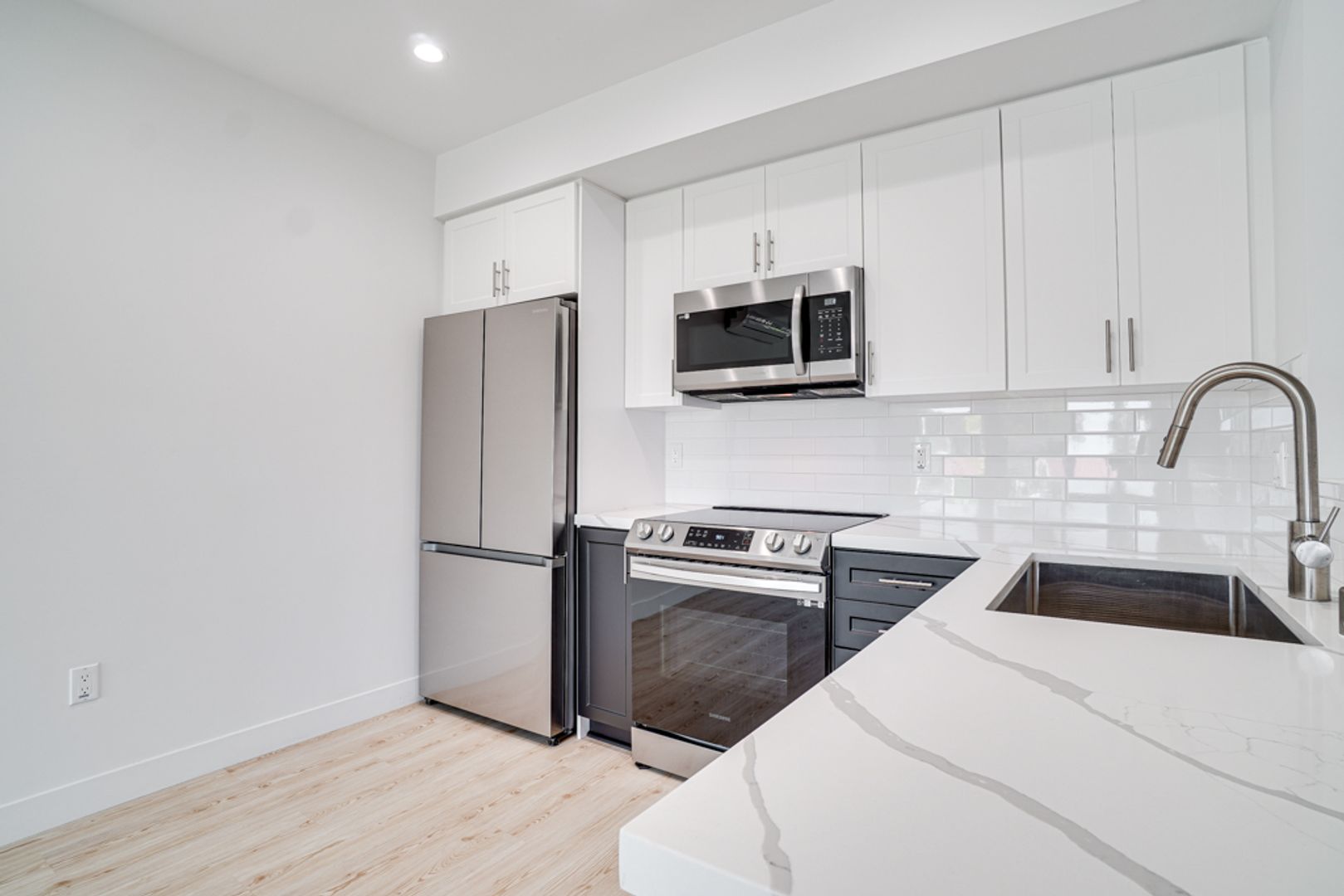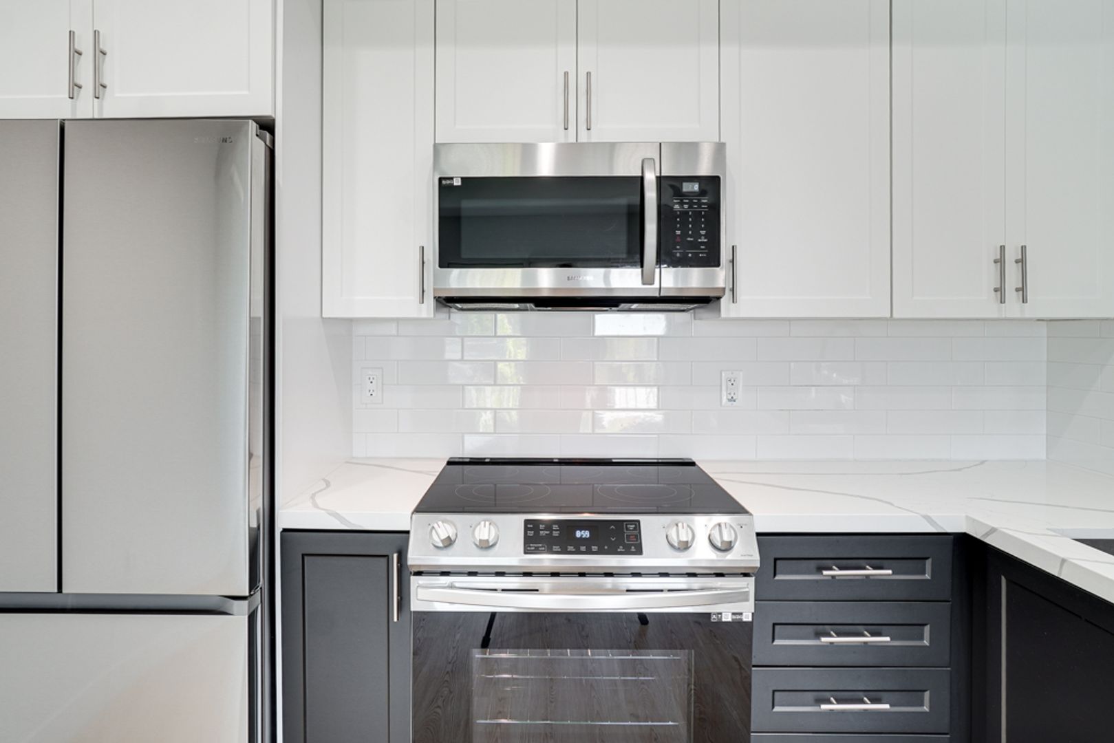 • Stainless steel appliances (refrigerator, stove, microwave)
